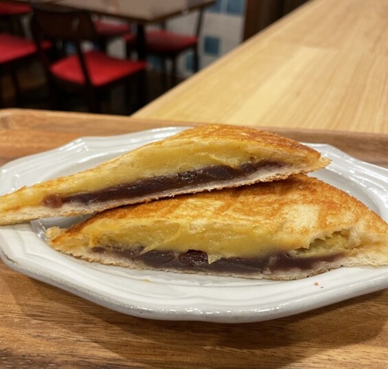 お店で焼いたお芋を使ったペーストと、こしあんが相性抜群で、バターのいい香りが食欲をそそる一品です。出来たてを食べていただきたいので、少々お時間いただきます。